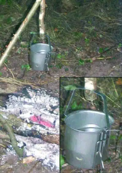 Met deze bekerhouder/ophangbeugel kan de Crusader mok (NATO mok) veilig boven een vuurtje gehangen worden. Omdat je de mok als mes tin kan gebruiken heb je minder kookgerei nodig.