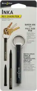 Nite Ize Inka Sleutelhanger Pen – een duurzame, lichtgewicht en waterdichte aluminium behuizing en zo ontworpen dat deze snel te gebruiken is als full-size pen. Deze unieke Write Anywhere -pen maakt gebruik van een onder druk staande, vervangbare inktcartridge waardoor deze in diverse extreme omstandigheden kan schrijven, onder elke hoek, zelfs ondersteboven, in extreme temperaturen en op elke hoogte toe. De pen is waterdicht en schrijft ook onder natte en koude omstandigheden en onderwater.
