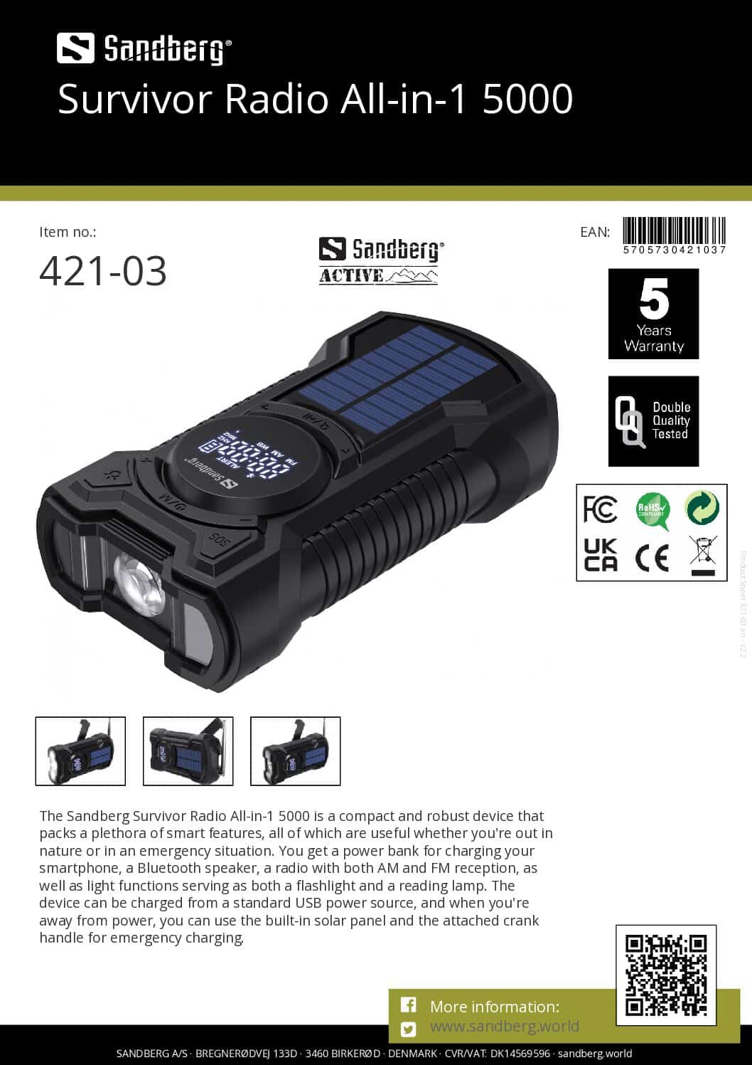 De Sandberg Survival Radio All-in-1 5000 is een compact en robuust apparaat met een overvloed aan slimme functies, die allemaal handig zijn, ongeacht of u zich in de natuur of in een noodsituatie of gewoon op kantoor, bevindt.