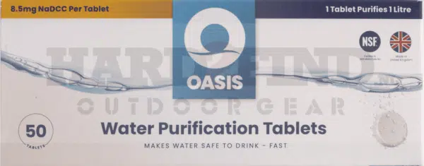 De waterzuiveringstabletten van Oasis worden geleverd in een doos van 50 stuks.